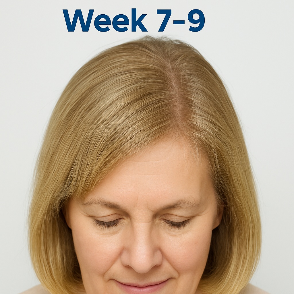 ✔️ Visible peach-fuzz growth in thinning zones (crown, part line)